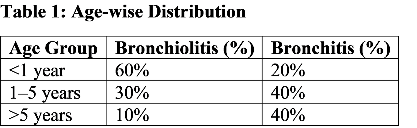 Bronchiolitis is primarily a viral infection affecting the small airways, with RSV being the most common causative agent [7]. The virus infects epithelial cells, leading to inflammation, edema, and necrosis, resulting in airway obstruction [8]. The results indicate that bronchiolitis predominantly affects infants under one year, which aligns with global epidemiological data [9]. The immature immune system and smaller airway diameter contribute to increased susceptibility and severity [10]. Bronchitis, on the other hand, involves larger airways and is often associated with viral infections such as influenza and adenovirus, although bacterial infections may occur [11]. Clinical manifestations such as wheezing, cough, and respiratory distress reflect airway obstruction and impaired gas exchange [12]. Feeding difficulties in infants with bronchiolitis are due to increased work of breathing [13]. Radiological findings such as hyperinflation and patchy infiltrates are common but not routinely required for diagnosis [14]. Diagnosis is primarily clinical, based on history and physical examination [15]. Management of bronchiolitis is mainly supportive, including oxygen therapy, hydration, and monitoring [16]. The use of bronchodilators, corticosteroids, and antibiotics is generally not recommended unless specific indications exist [17]. Comparative studies show consistent findings worldwide, although disease severity is higher in low-resource settings due to delayed access to healthcare [18]. Preventive measures such as breastfeeding, vaccination, and avoidance of tobacco smoke exposure significantly reduce disease incidence [19]. From a clinical perspective, early recognition and appropriate supportive care are essential to reduce morbidity and prevent complications such as respiratory failure [20].