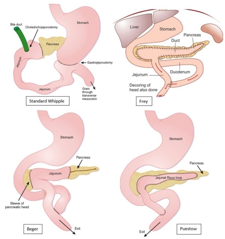 Figure 3. Depiction of the final gross anatomical changes associated with the Whipple, Frey, Beger, and Puestow procedures.