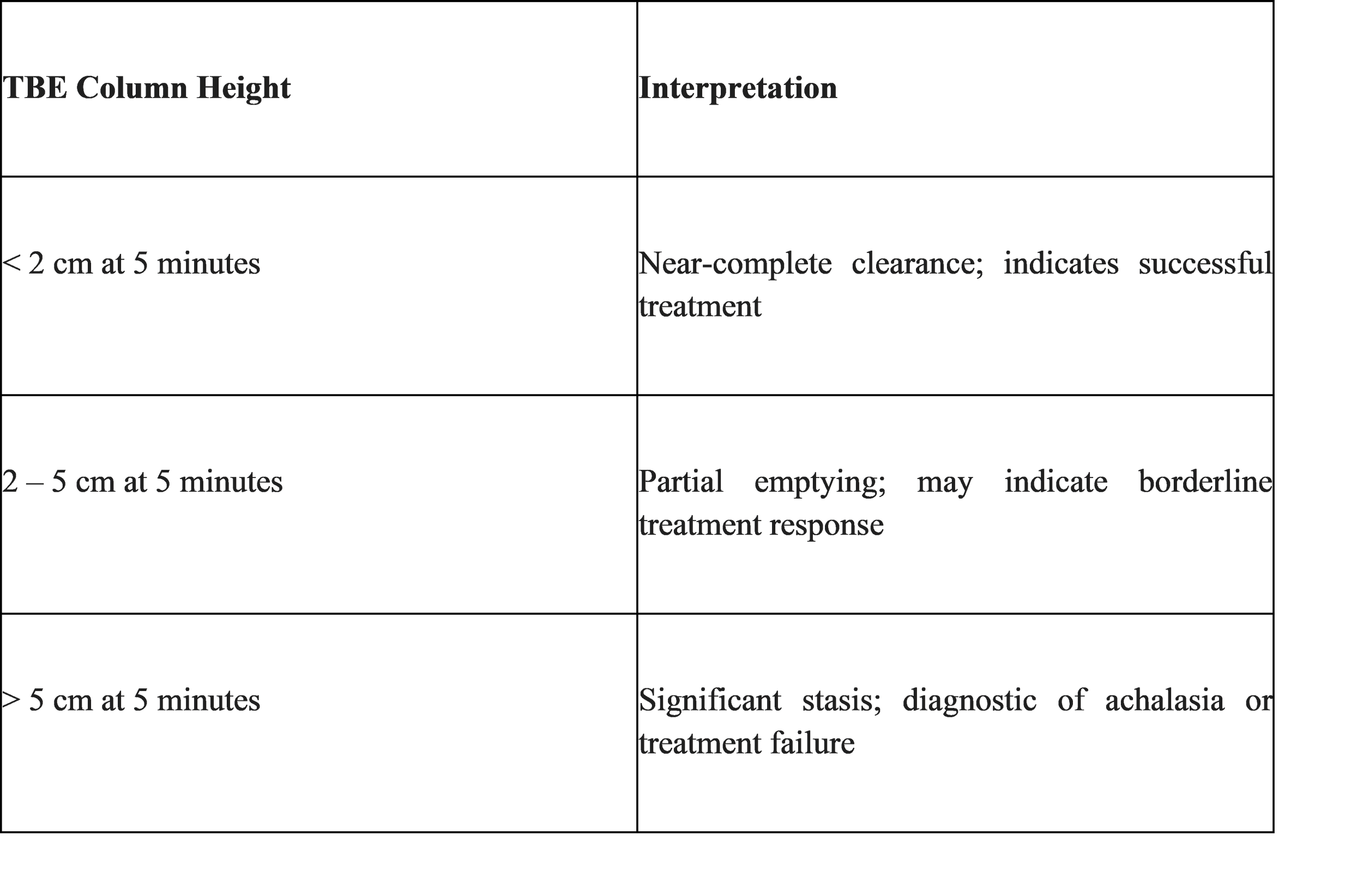 The Timed Barium Esophagogram (TBE) is a specialized technique used to quantify the rate of esophageal emptying.1 The patient drinks a standard volume of barium (100–250 mL), and spot films are taken at 1, 2, and 5 minutes.31 In healthy individuals, the esophagus clears the barium completely within 1 minute.31 In achalasia, a column of barium persists beyond 5 minutes, and the height of this column is a reliable predictor of treatment success or failure.1