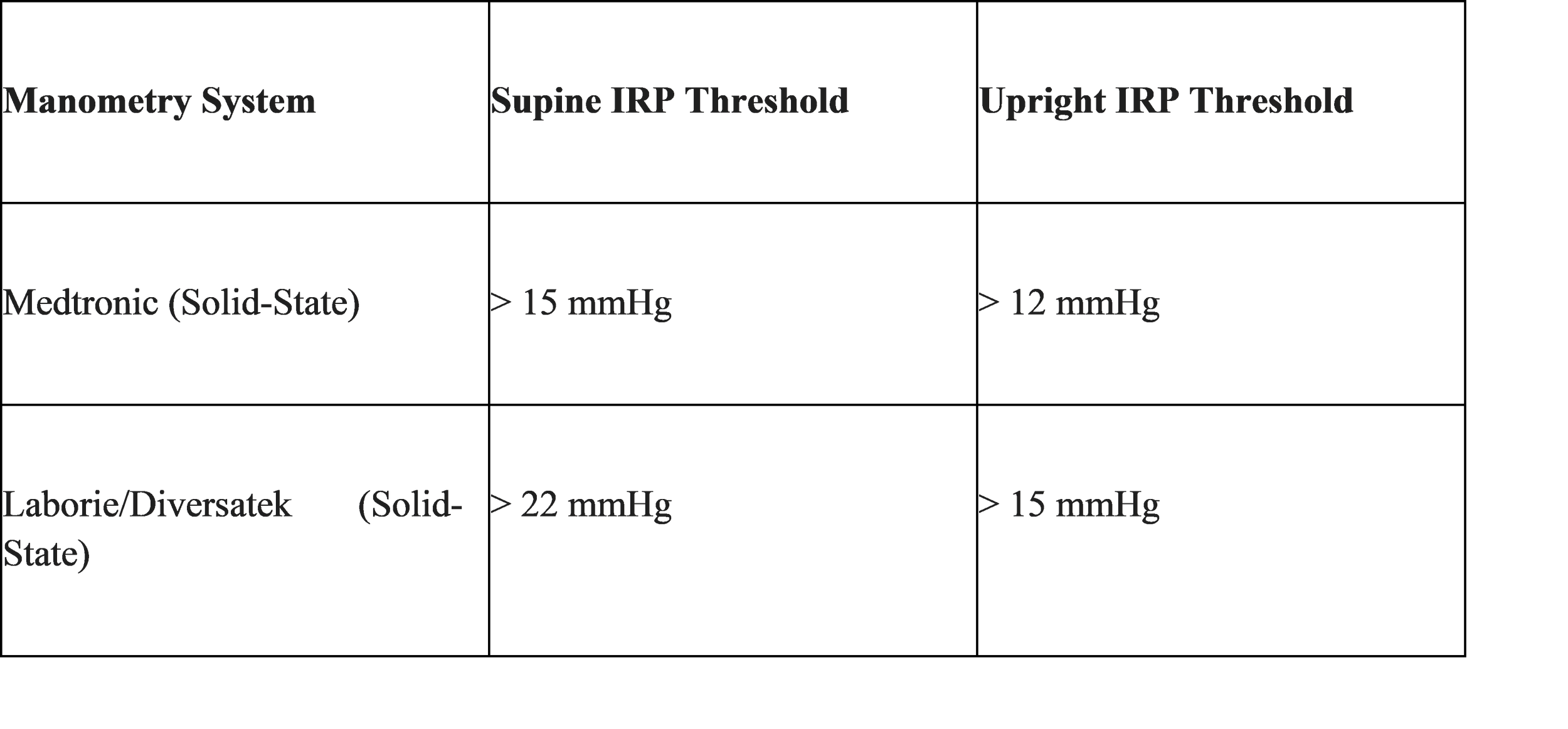 ● Integrated Relaxation Pressure (IRP): The primary threshold for failed relaxation. The threshold varies based on the type of manometry catheter used and the patient's position during the test.34
