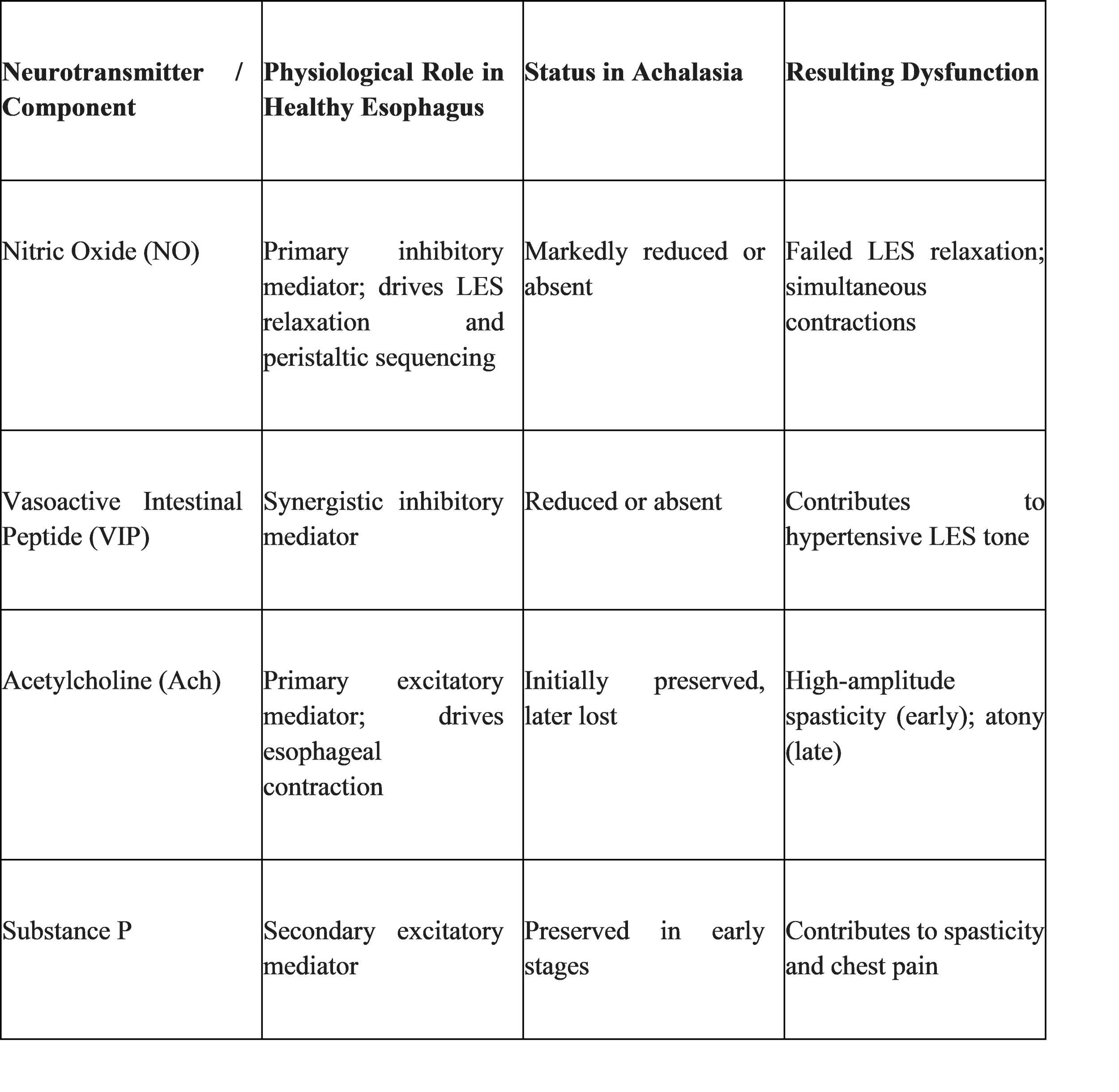 The pathophysiology of achalasia is rooted in a fundamental imbalance between excitatory and inhibitory neurotransmission within the enteric nervous system (ENS).1 In a healthy physiological state, swallowing triggers a wave of contraction mediated by excitatory neurotransmitters such as acetylcholine and substance P.1 Simultaneously, a wave of "deglutitive inhibition" precedes the contraction, mediated by inhibitory neurons that release nitric oxide (NO) and vasoactive intestinal peptide (VIP).1 This inhibitory wave is essential for ensuring that the lower esophageal sphincter (LES) relaxes ahead of the bolus and that the contractions of the esophageal body are sequenced in a progressive, aboral direction.2