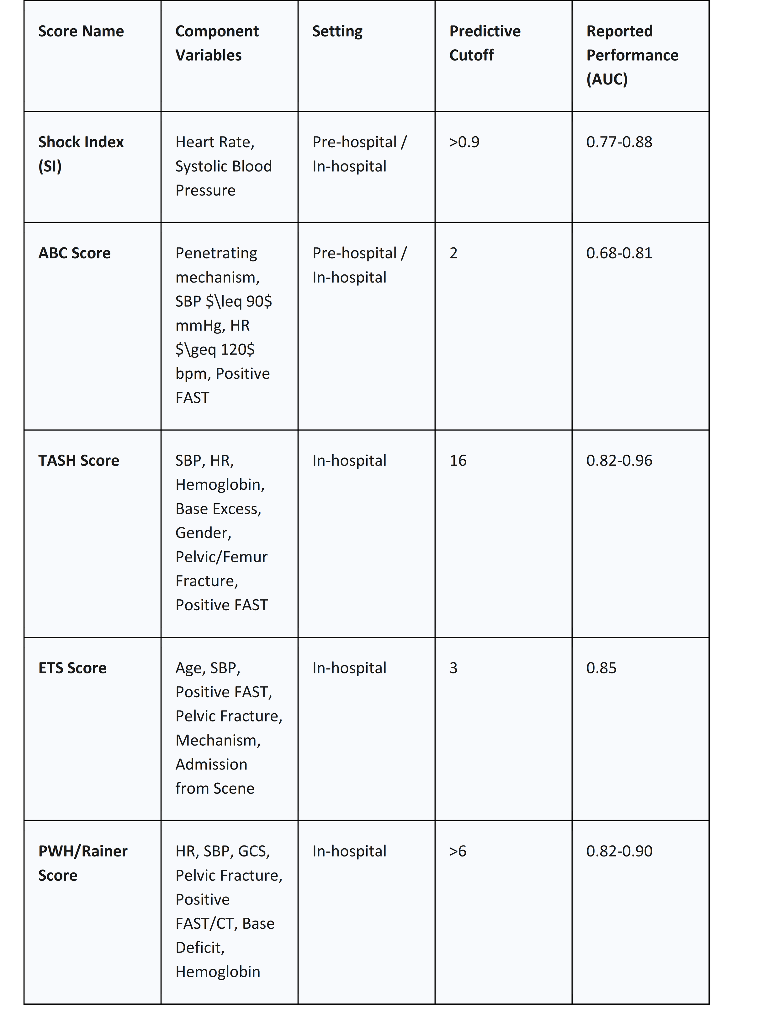 Table 2: Comparison of Clinical Prediction Scores for Massive Hemorrhage