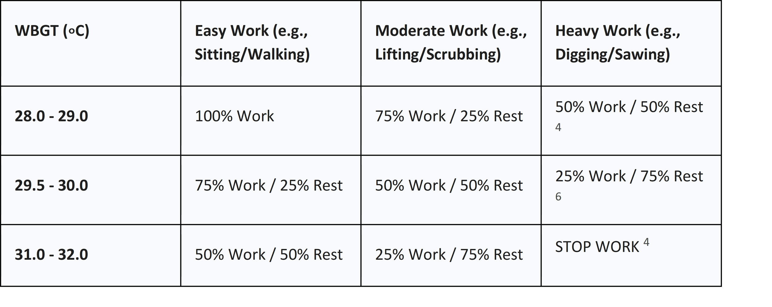 The ACGIH and NIOSH provide detailed work-rest cycles based on the measured WBGT and the metabolic rate of the task.1