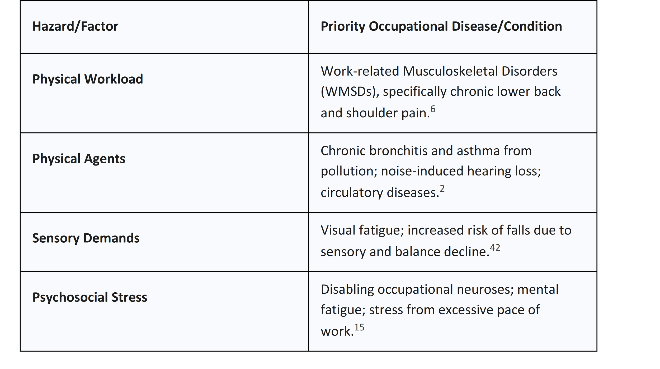 As the global population ages, older workers (those whose difficulties in employment arise from advancing age) are required to stay in the workforce longer.42 While aging is a heterogeneous process, it is often accompanied by a decline in muscle mass, sensory acuity (hearing and vision), and a decreased ability to recover from physical strain or injury.42