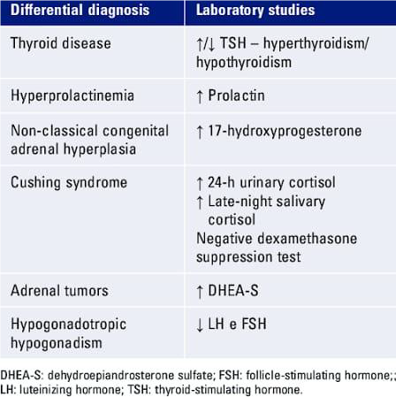 Testing includes pregnancy testing and measurement of FSH, prolactin, and TSH to exclude other possible causes of symptoms. Also, serum cortisol is measured to exclude Cushing syndrome, which may cause oligomenorrhea, hirsutism, and obesity.