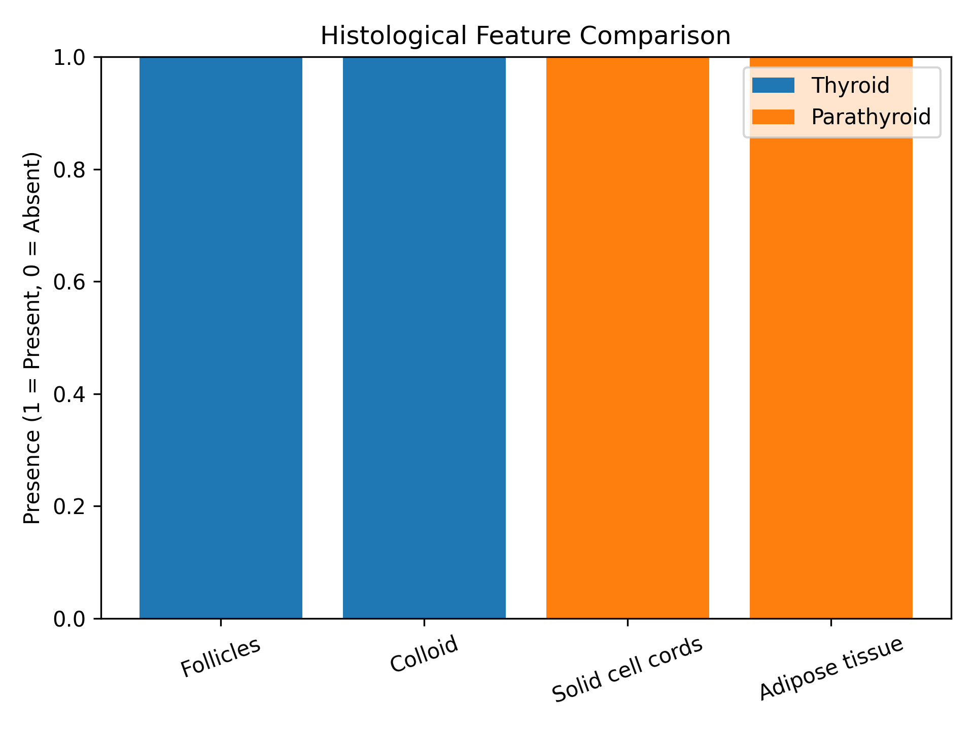 Current medical education and diagnostic pathology emphasize the importance of recognizing normal histological patterns to differentiate them from pathological states such as thyroiditis, goiter, adenomas, and hyperparathyroidism. However, integrated histology-based comparisons of the thyroid and parathyroid glands are often underrepresented in the literature.