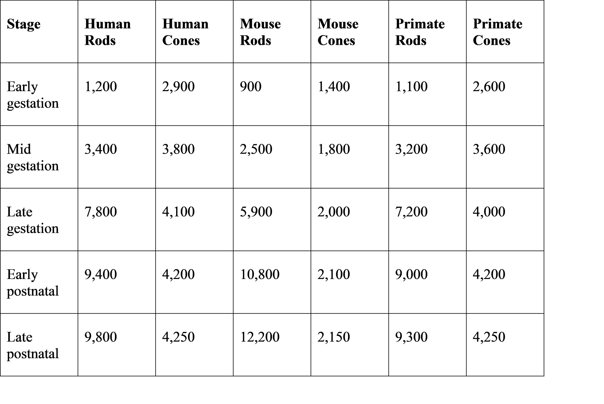 Cone differentiation peaked earlier, while rod density increased significantly in late gestation and postnatal stages.