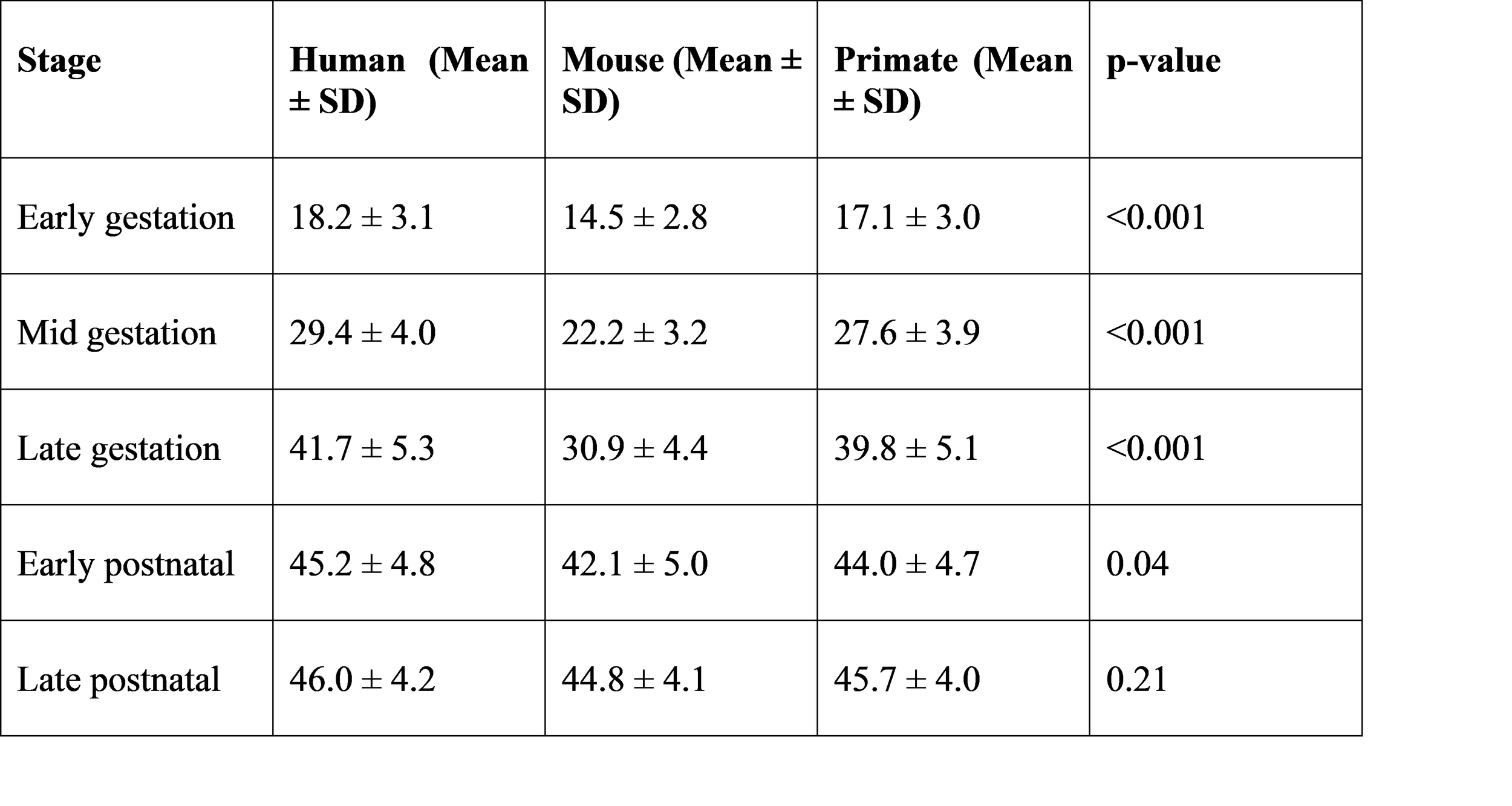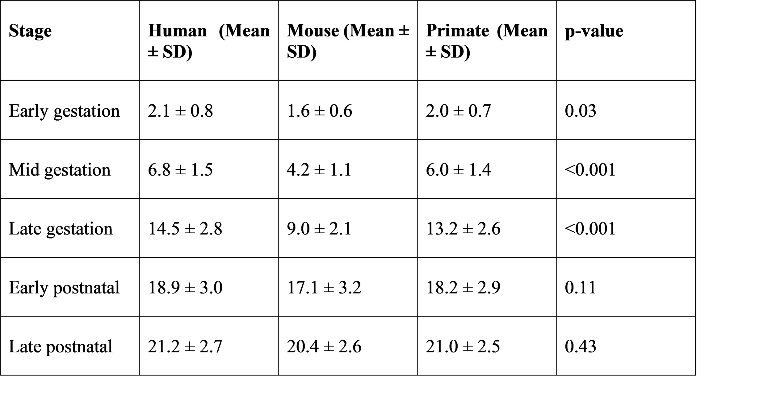 Human and mammalian samples were categorized into developmental stages for comparison.