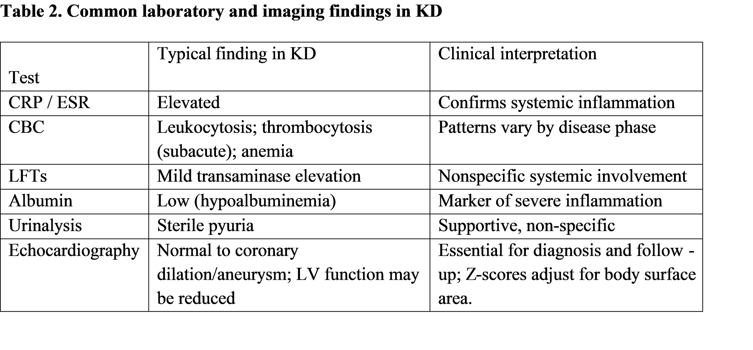 Incomplete (atypical) KD: Many infants and some young children present with prolonged fever and fewer than four principal features despite laboratory or echocardiographic evidence of systemic inflammation; these incomplete cases have higher risk of diagnostic delay and coronary complications if not recognized promptly. Typical supporting laboratory findings include elevated C-reactive protein (CRP) and erythrocyte sedimentation rate (ESR), leukocytosis, thrombocytosis in the subacute phase, hypoalbuminemia, elevated transaminases, and sterile pyuria.