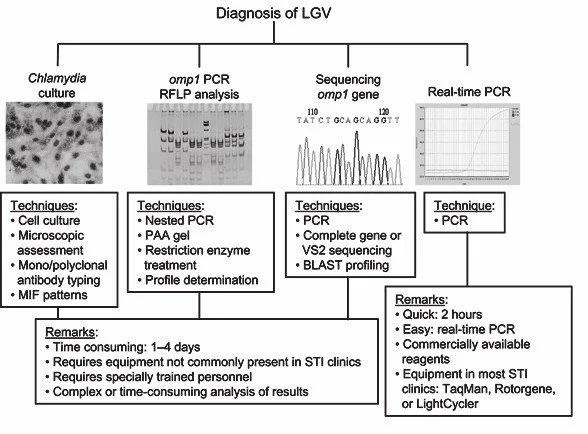 3) enlarged or fluctuant lymph nodes or buboes aspirate(when inguinal LGV is suspected).After topical disinfection, a 21-gauge needle should be inserted into the lymph node through healthy adjacent tissue and the pus aspirated into a syringe; a small volume (,0.5 mL) of saline solution may be injected and re-aspirated for nonfluctuant nodes.Urethral swab or first-catch urine specimen can be used as a sample when urethritis and/or inguinal lymphadenopathy is present and LGV is suspected as the cause. Urine specimen usually shows negative PCR results in case of anorectal manifestation of LGV . A two-step procedure is usually followed. The first step includes C. trachomatis NAAT test (test only confirms presence of C. trachomatis, and does not allow serogroup identification). NAAT s are not approved for testing samples from extra-genital sites,but studies have demonstrated high sensitivity and specificity in rectal chlamydial infections.