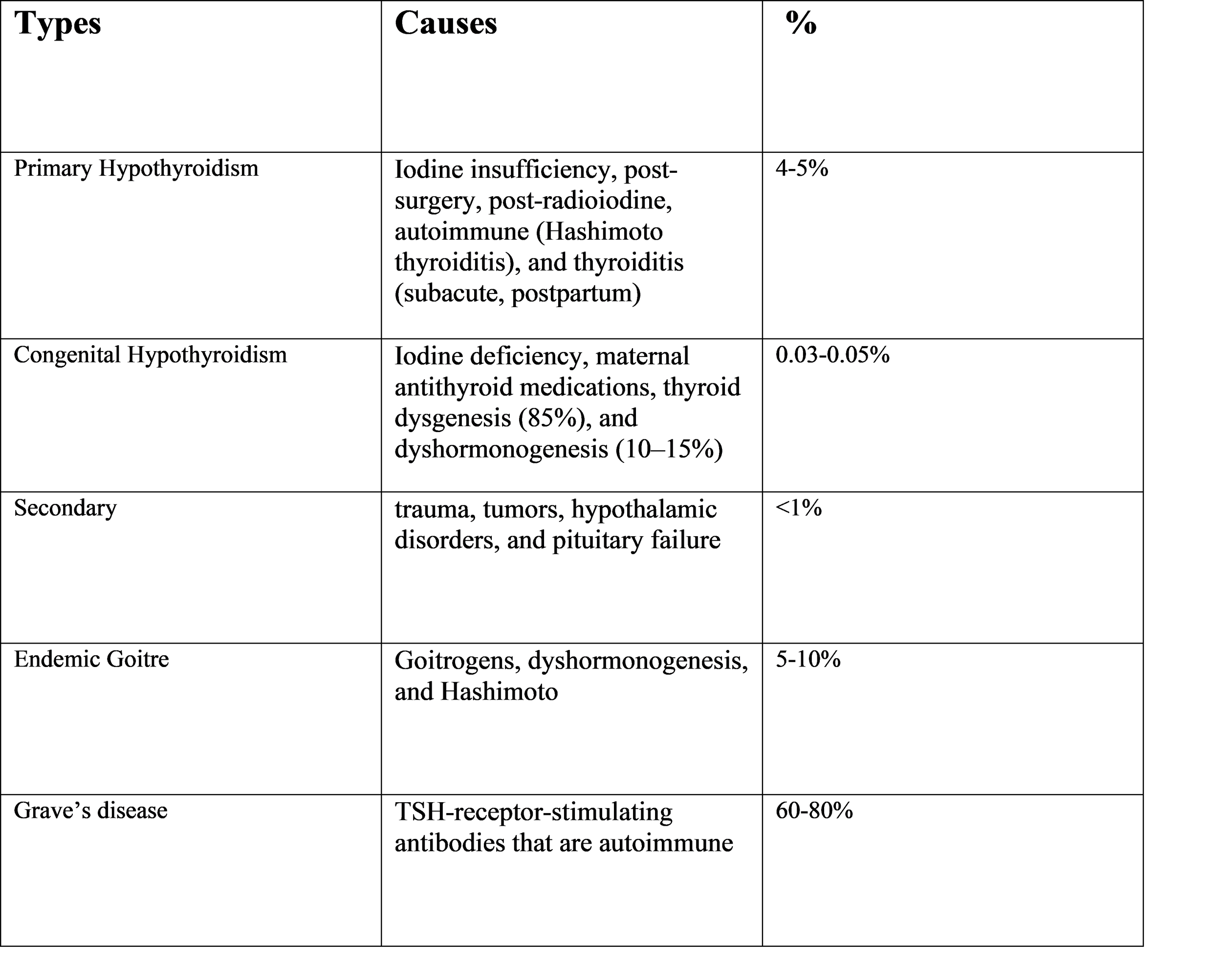 Thyroid gland diseases include a broad range of conditions that can impact people of all ages, from young children to the elderly. Through the production of the hormones T3 and T4, the thyroid gland is essential for controlling growth, development, and metabolism. Growth retardation, neurodevelopmental delay, weariness, weight gain, and, in extreme situations, myxedema or myxedema coma can result from hypothyroidism, whether it is congenital owing to thyroid dysgenesis or dyshormonogenesis or acquired via autoimmune illness, iodine shortage, or surgical procedures. Weight loss, heat intolerance, tremors, palpitations, osteoporosis, and in Graves' disease, ophthalmopathy are symptoms of hyperthyroidism, which is most frequently brought on by toxic nodular goiter, thyroiditis, or Graves' disease. Thyroid storm and arrhythmias are possible side effects.