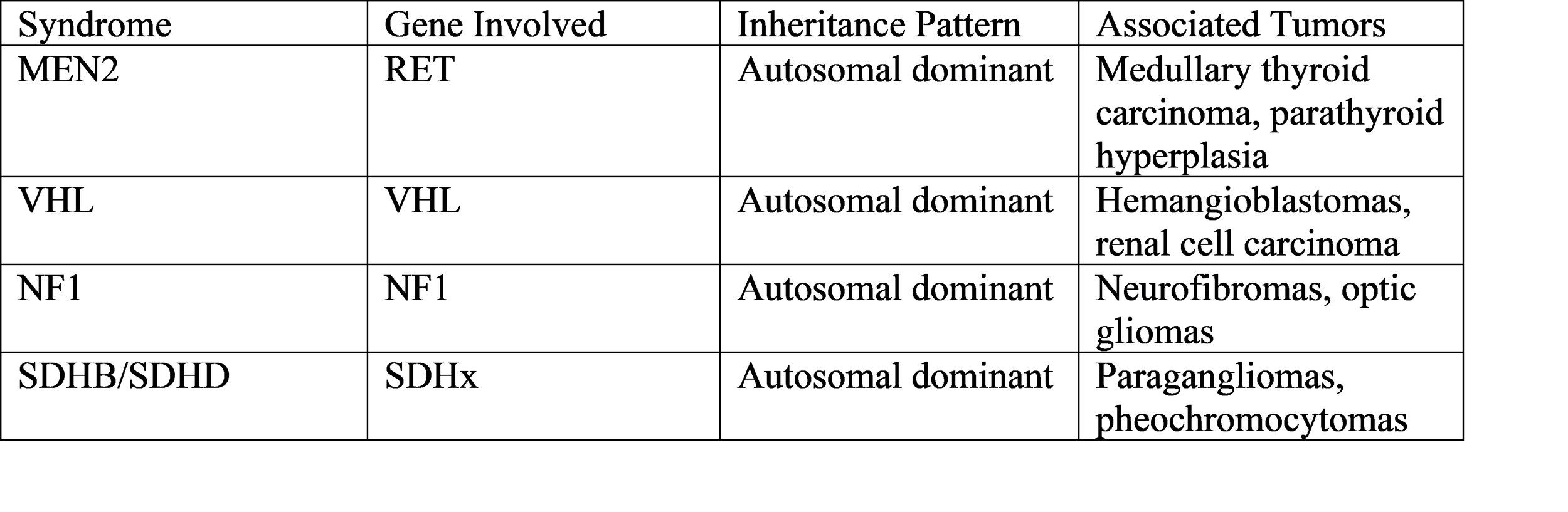 Mutations in a number of susceptibility genes are found through genetic testing. RET (MEN2), VHL, NF1, and SDHx gene mutations are the most prevalent. All patients should receive genetic counseling because hereditary forms affect surveillance and treatment plans.
